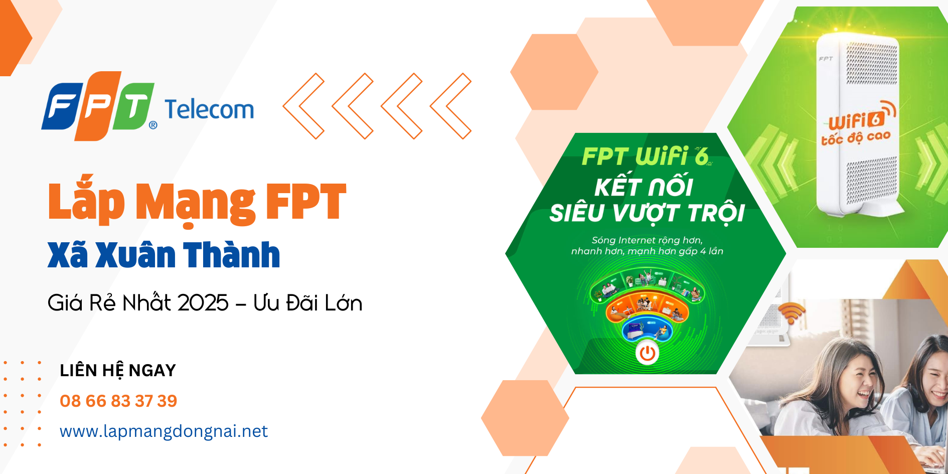 Bạn đang tìm kiếm dịch vụ lắp mạng FPT Xã Xuân Thành uy tín, giá rẻ với tốc độ cao? Lắp Mạng Đồng Nai tự hào là đối tác tin cậy của FPT Telecom, mang đến cho bạn trải nghiệm internet tuyệt vời nhất tại Xã Xuân Thành. Với nhiều năm kinh nghiệm trong lĩnh vực cung cấp và lắp đặt mạng FPT, chúng tôi cam kết mang đến cho bạn dịch vụ chất lượng, nhanh chóng và chuyên nghiệp.